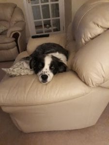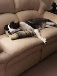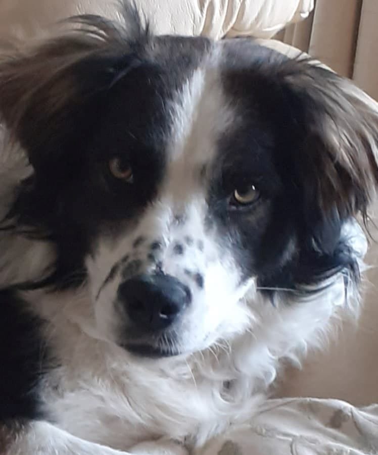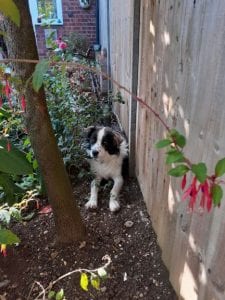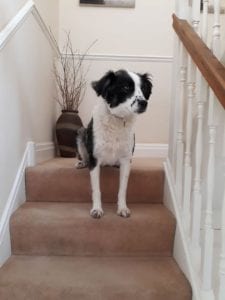 Cassie settled in with me very quickly. She is loving and affectionate and loves cuddles and tummy tickles. She plays with her toys and with me. She does puppy mouth on occasions. She is very trusting of me. She is fully house trained. She loves being out walking and meeting other dogs. She will be playful with them. She is a very clever bright little girl who learns fast. She would benefit greatly from living with other dogs whom she would learn from and would love playing with. Cassie still needs some support to develop and to know that she’s safe.  She’s a frightened little girl and can be startled by sudden noise. Cars are ok but anything larger worries her. Thunder and probably fireworks. She pulls hard on the lead and I now have a non-pull harness. She is reactive to men when out walking but with constant exposure this is improving. She is very fearful when visitors come to the house. This is being worked on. She is very food orientated and this is helping with training.