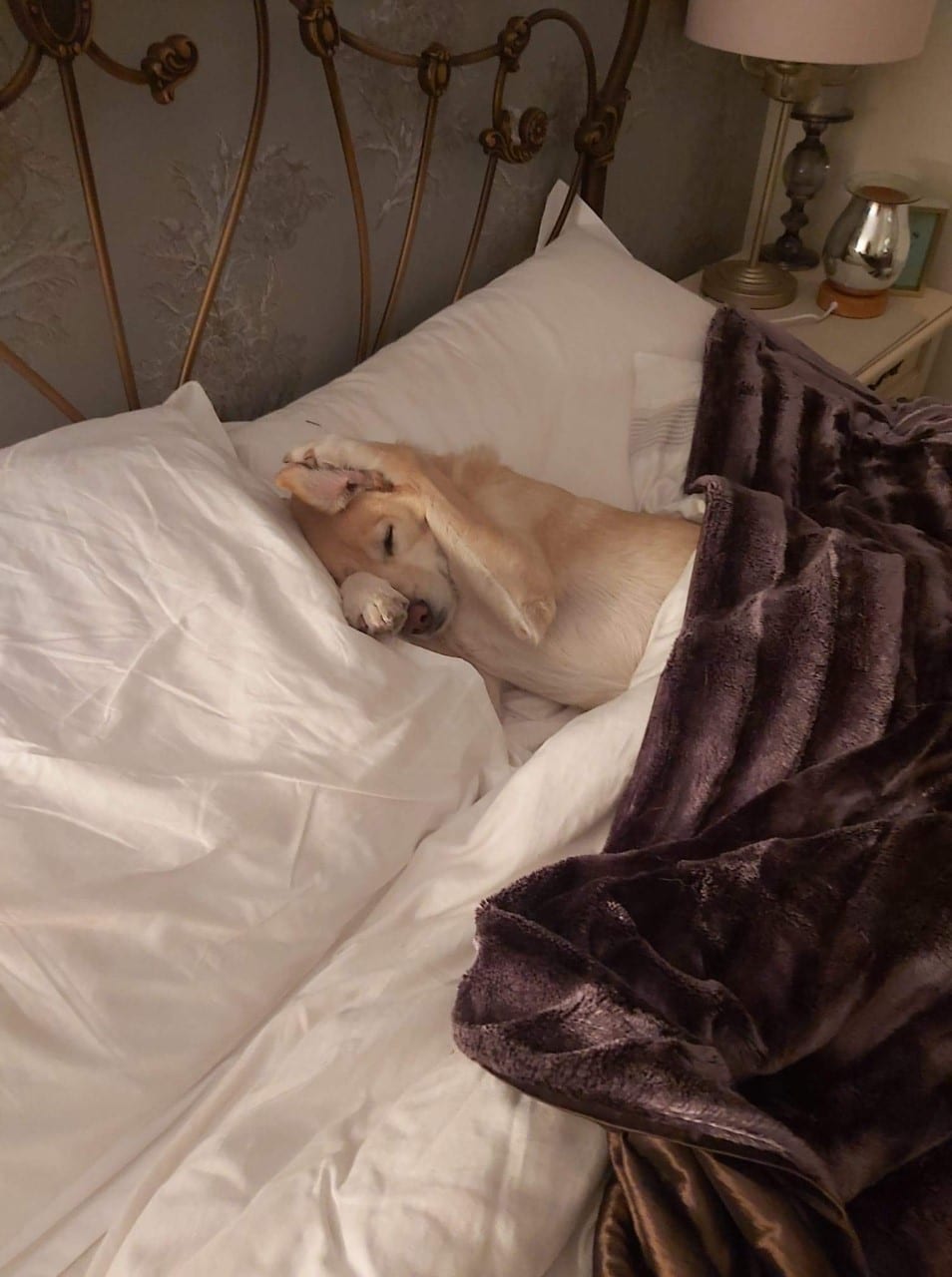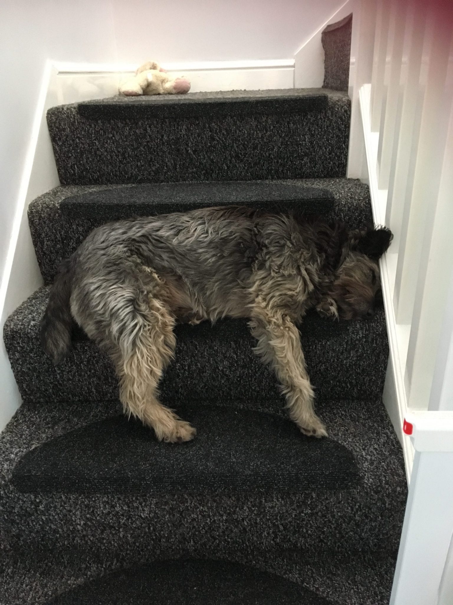 The process was easy, everyone was helpful, and in July 2017, we drove to Glasgow to pick him up. Before Covid, Pete came into my work with me every day and was made a fuss off by everyone. He just settled down in his bed and was as good as gold.