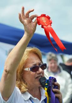 Romanian rescue dog jumping up at man | 1 Dog At a Time Rescue UK | Dedicated To Rescuing and Rehoming Romanian Street Dogs  Lady in a hat holding a dog with rosette at the dog show | 1 Dog At a Time Rescue UK